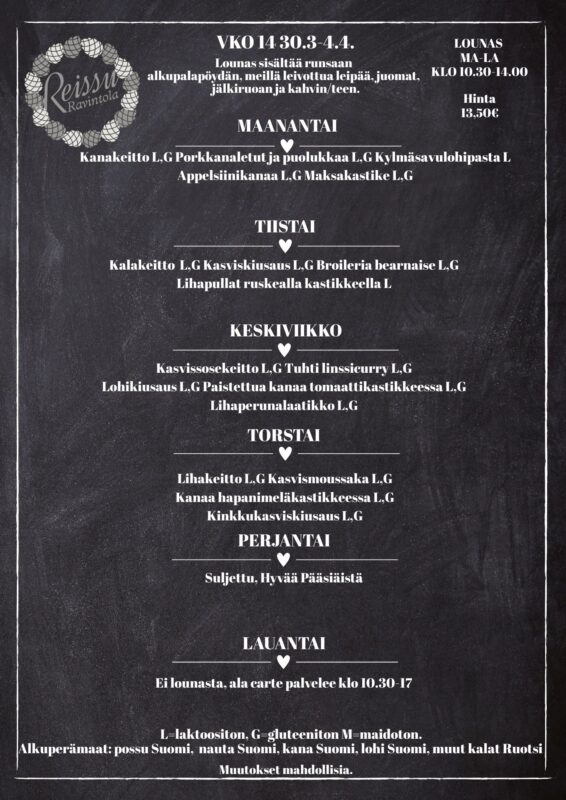 Joskus tilanteet muuttuvat äkillisesti, pyrimme valmistamaan ruokaa tarpeen ja raaka-aineiden saatavuuden mukaan, tarkistathan ajantasaisen lounaslistan aina ravintolasta.